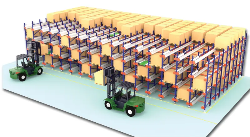 - FIFO (First In, First Out): Pallet đầu tiên được đưa vào lưu trữ trên mỗi làn kệ sẽ là pallet đầu tiên được lấy ra từ làn đó. Xe nâng hoạt động ở cả hai phía của kho – một phía để lưu trữ hàng và phía còn lại để dỡ hàng. Phương thức này lý tưởng cho các kho được thiết kế làm vùng đệm giữa hai khu vực, như kho trung gian hoặc kho sản xuất.